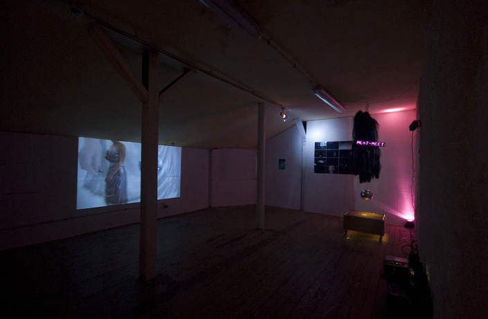 Video on walls (« Meat meet », photographies (« I saw you last night » serie), lightbox on wheels, hair, discoball, strobe lights and pink light.